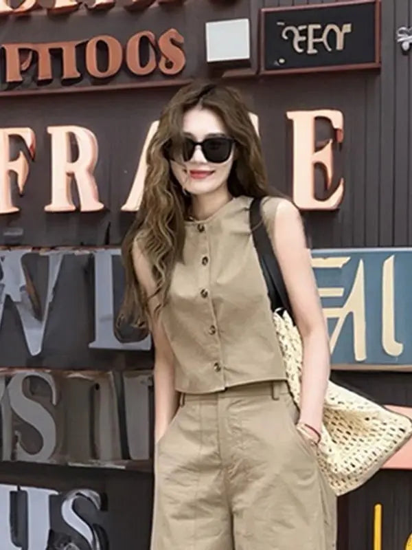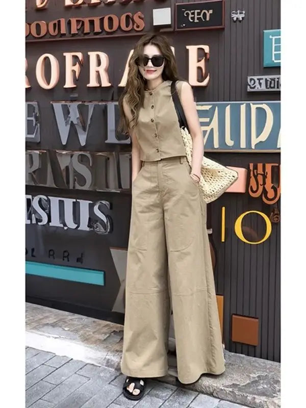 Ensemble Casual Chic & Vintage – Gilet Sans Manches et Pantalon Large Kaki